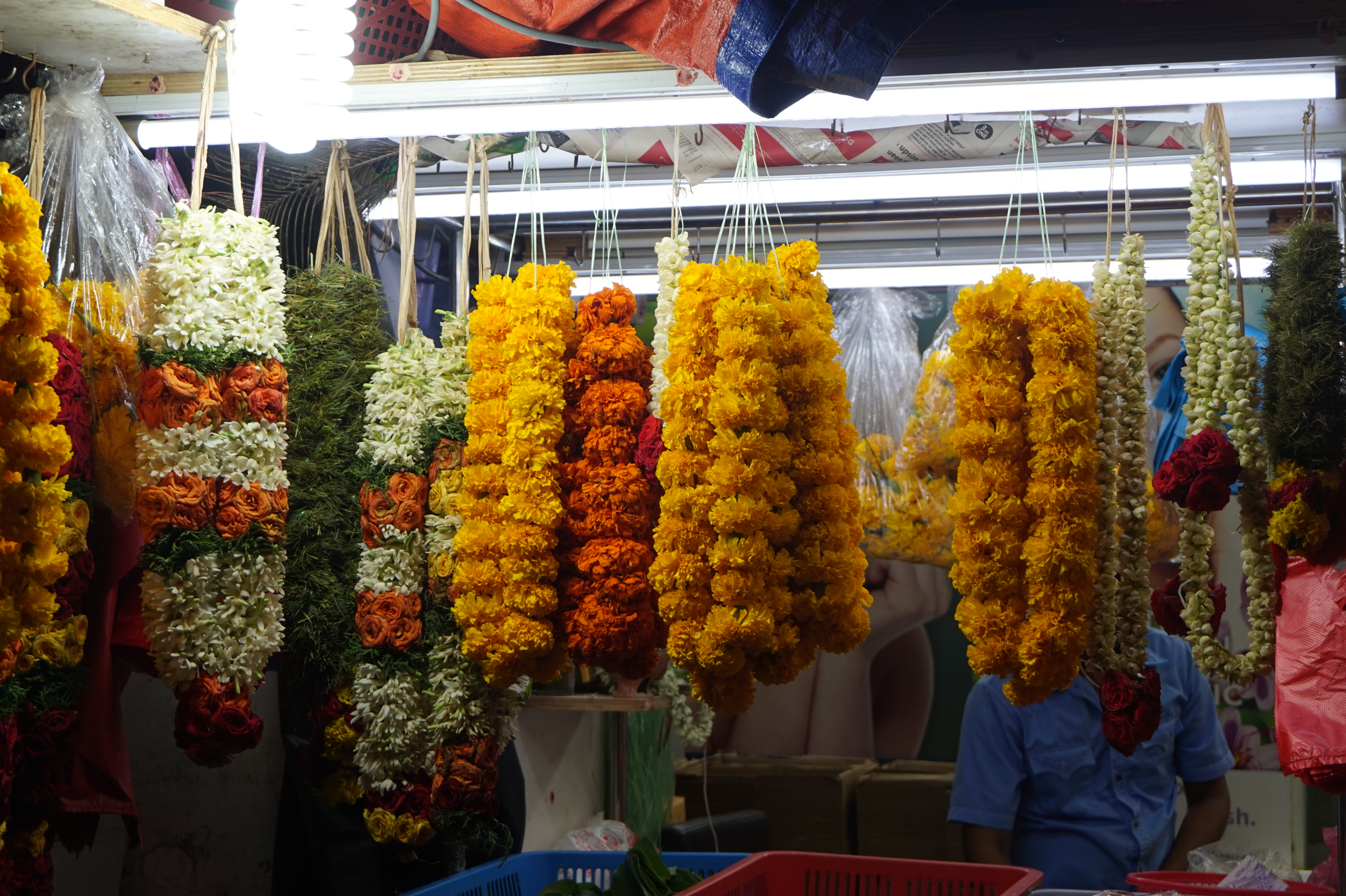 En se baladant dans Little India au cours du dernier mois, nous avons pu voir les rues s’habiller de structures gigantesques recouvertes de milliers de fleurs (artificielles pour que cela tienne dans la durée) ou orner les routes.
